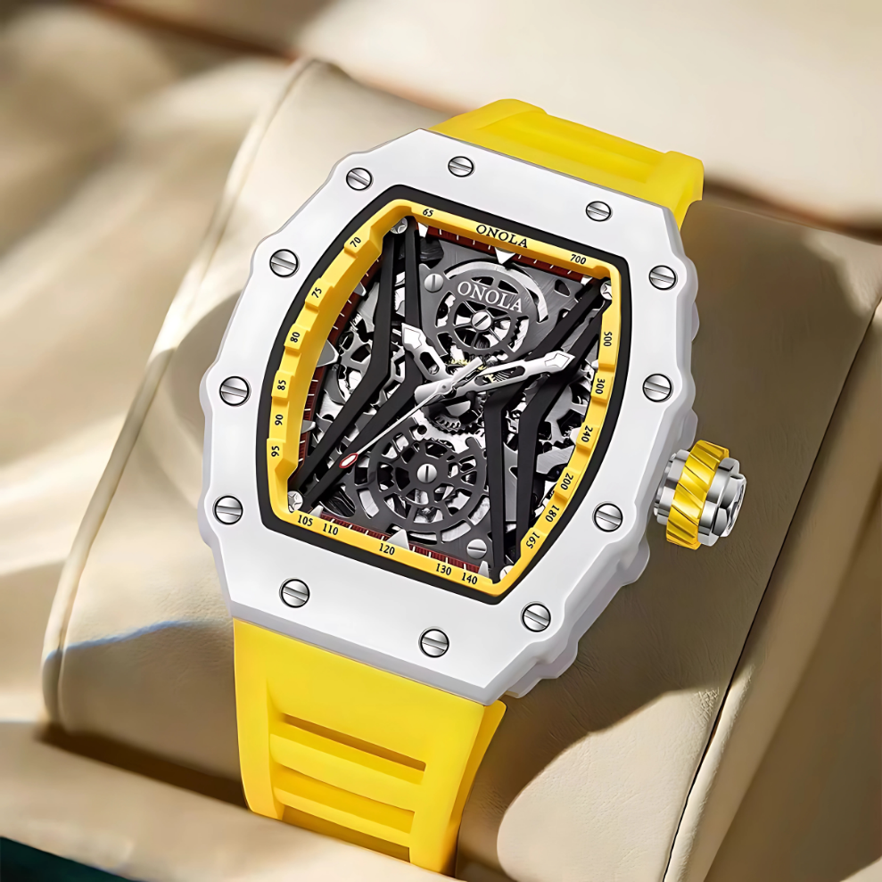 Combining bold design, precision engineering, and contemporary style, the ONOLA 3828 is the perfect choice for men seeking both refinement and functionality. With its silicone strap and open-heart mechanical movement, it turns heads while ensuring durability and reliability.
